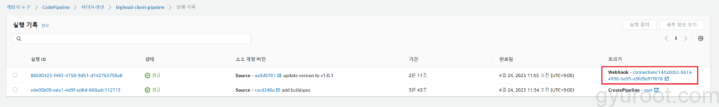 - GitHub 리포지토리 push 이벤트에 대한 Webhook 트리거에 의해 실행된 기록