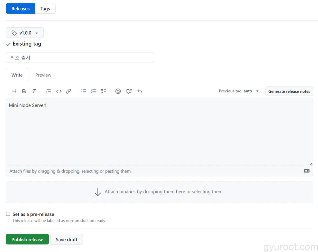 - Release title 및 Release notes는 여러분이 자유롭게 입력하세요.