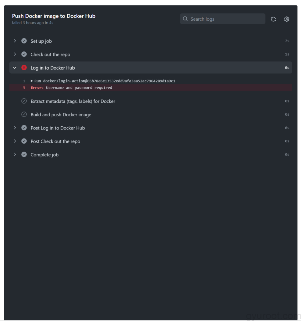 ❓ GitHub Action 실행이 실패한 이유 워크플로가 secrets 환경변수의 DOCKER_USERNAME 과 DOCKER_PASSWORD 를 참조하고 있지만 환경변수를 생성하지 않았기 때문
