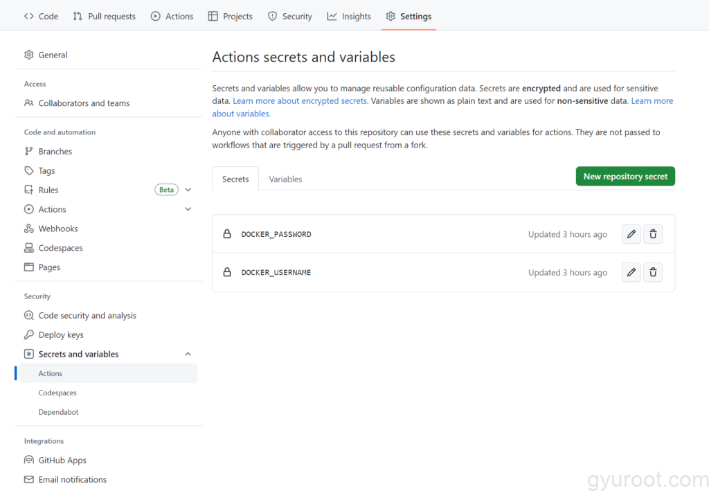 Step 2 : Workflow YAML 파일을 자세히 살펴보면, DOCKER_USERNAME 및 DOCKER_PASSWORD라는 환경 변수가 존재합니다. 말 그대로 아이디와 비밀번호와 같은 민감정보를 YAML 코드에 입력해서 git commit 기록으로 남겨둔다면, 더 이상은 그 비밀번호를 사용할 수 없게 될 것입니다.
