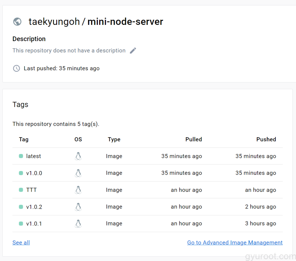Step 1 : 앞서 이 과정을 다 잘 따라왔다면, 여러분 각 개인의 Docker Hub에는 mini-node-server 이미지가 성공적으로 push되어 있을 겁니다. https://hub.docker.com/u/<여러분_아이디>에 들어가서 결과를 확인해 보세요.