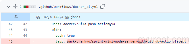 tags 키값은 github 레파지토리 이름이 아닌 dockerhub의 레파지토리로 생성할 이미지 명으로 설정해야 하므로 위와 같이 수정을 하였다.