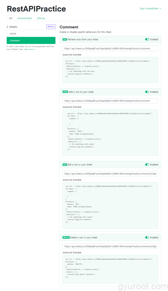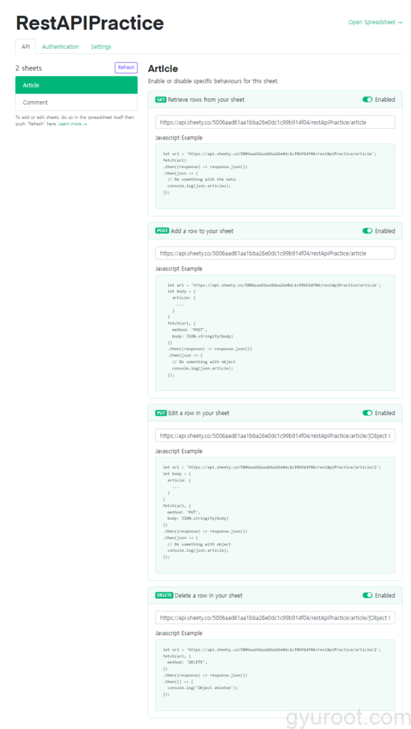 ⬛ 스프레드시트로 작성한 데이터 모델을 Sheety와 연동하세요.