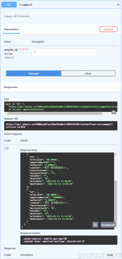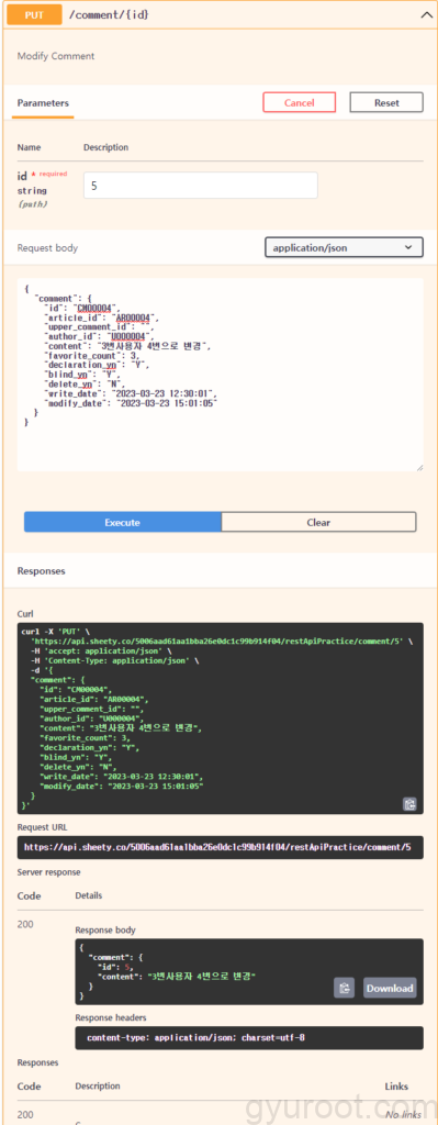 ⚡ 1. 조회 1. 블로그 글 전체 조회 2. 특정 블로그 글 조회 3. 모든 댓글 조회 4. 특정 댓글 조회 2. 생성 1. 새 블로그 글 생성 2. 새 댓글 생성 3. 삭제 1. 특정 블로그 글 삭제 2. 특정 댓글 삭제 4. 수정 1. 특정 블로그 글 수정 2. 특정 댓글 수정