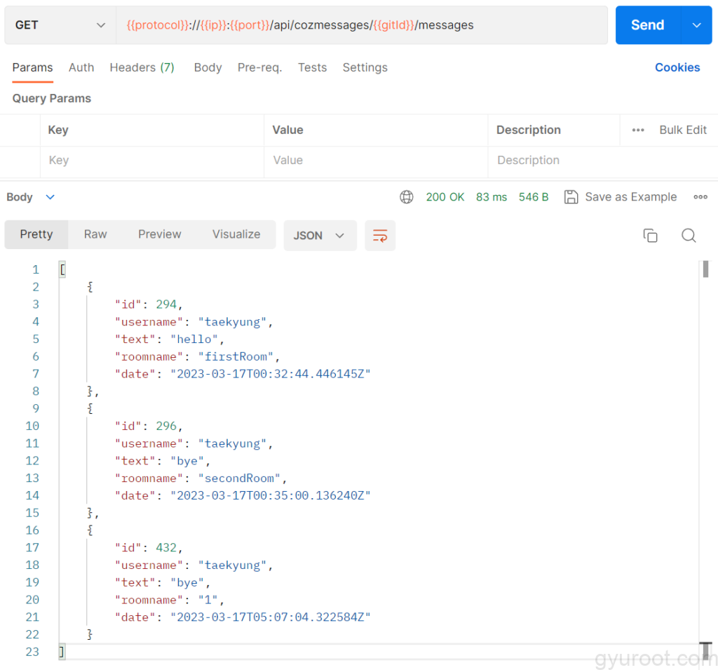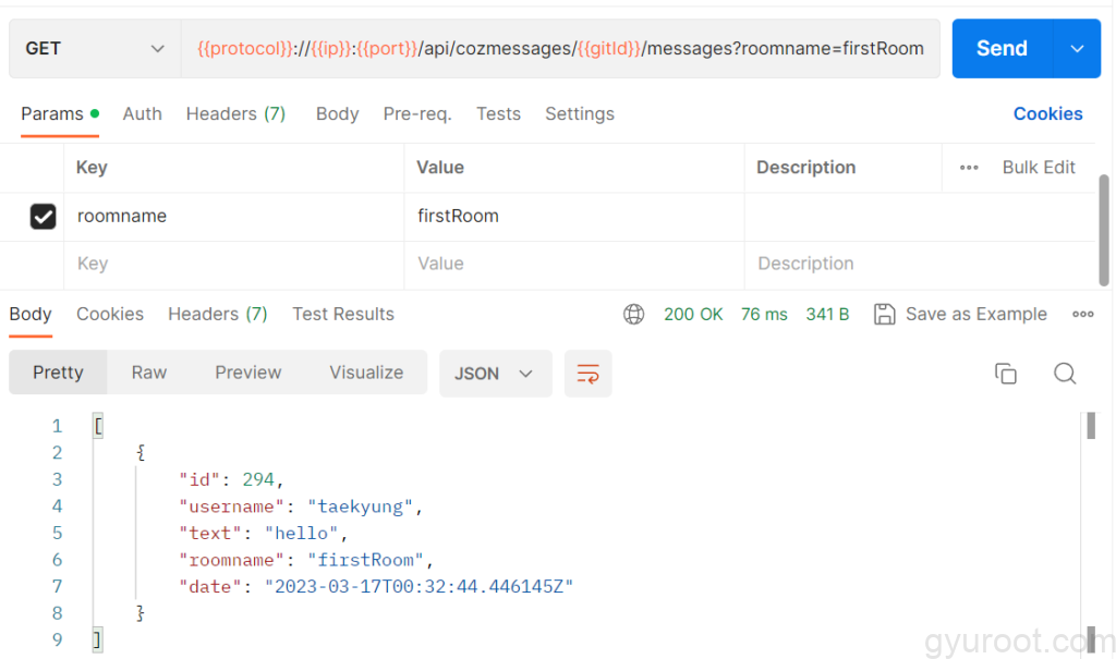 “firstRoom” 이라는 방이름을 가진 메시지가 조회된다.