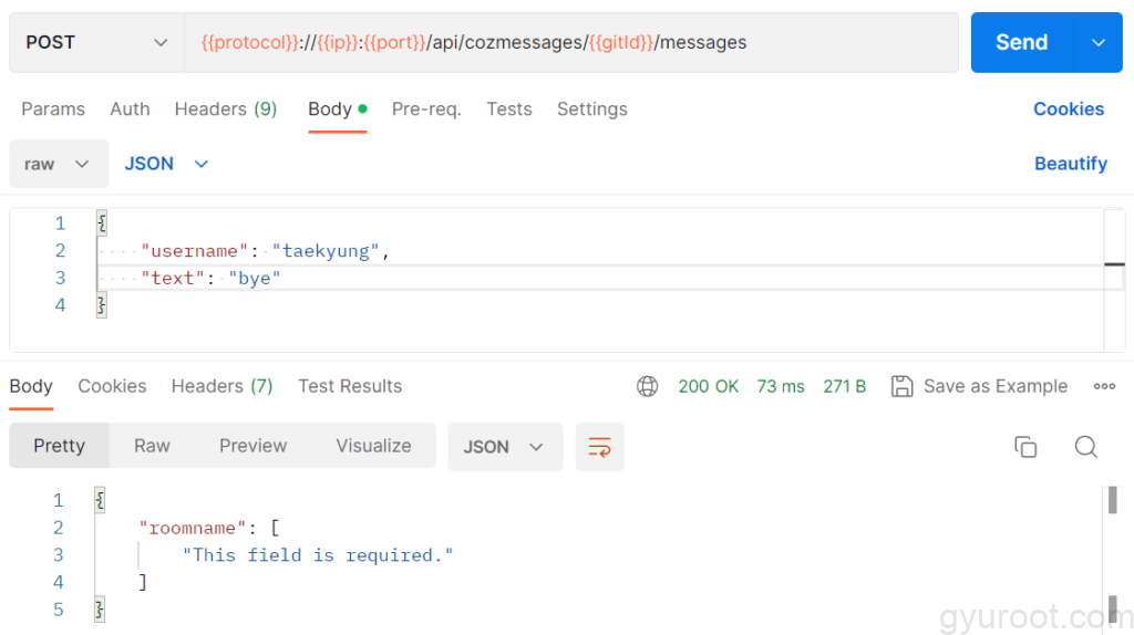 HTTP Status Code 는 200 OK 로 반환되나, roomname 필드가 필수값이라는 메시지가 출력된다.