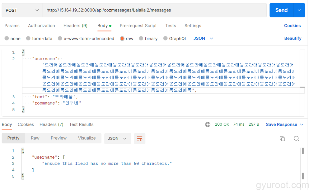 위처럼 Send할 경우 200 OK로 정상 응답이 되지만 age는 무시되고 username, text, roomname 만 들어감