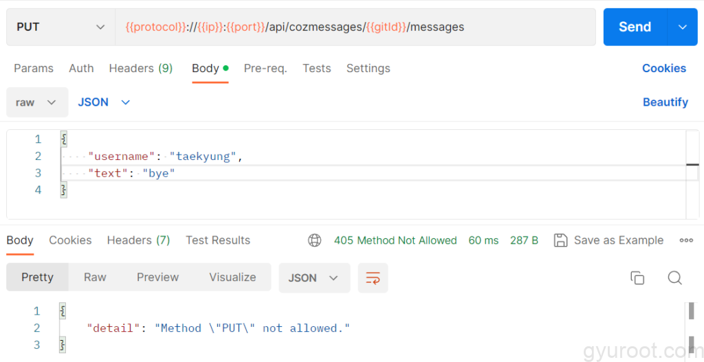 405 에러가 반환되며, Method "PUT" not allowed. 메시지가 출력된다.